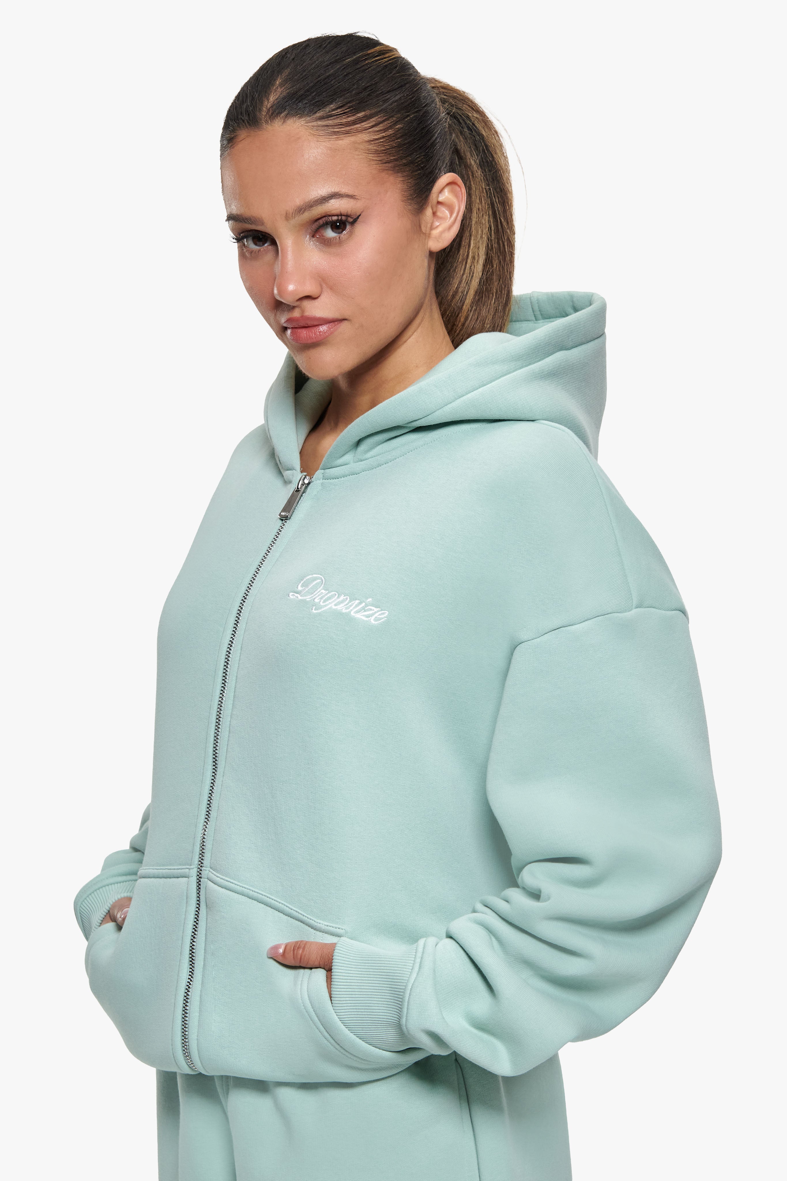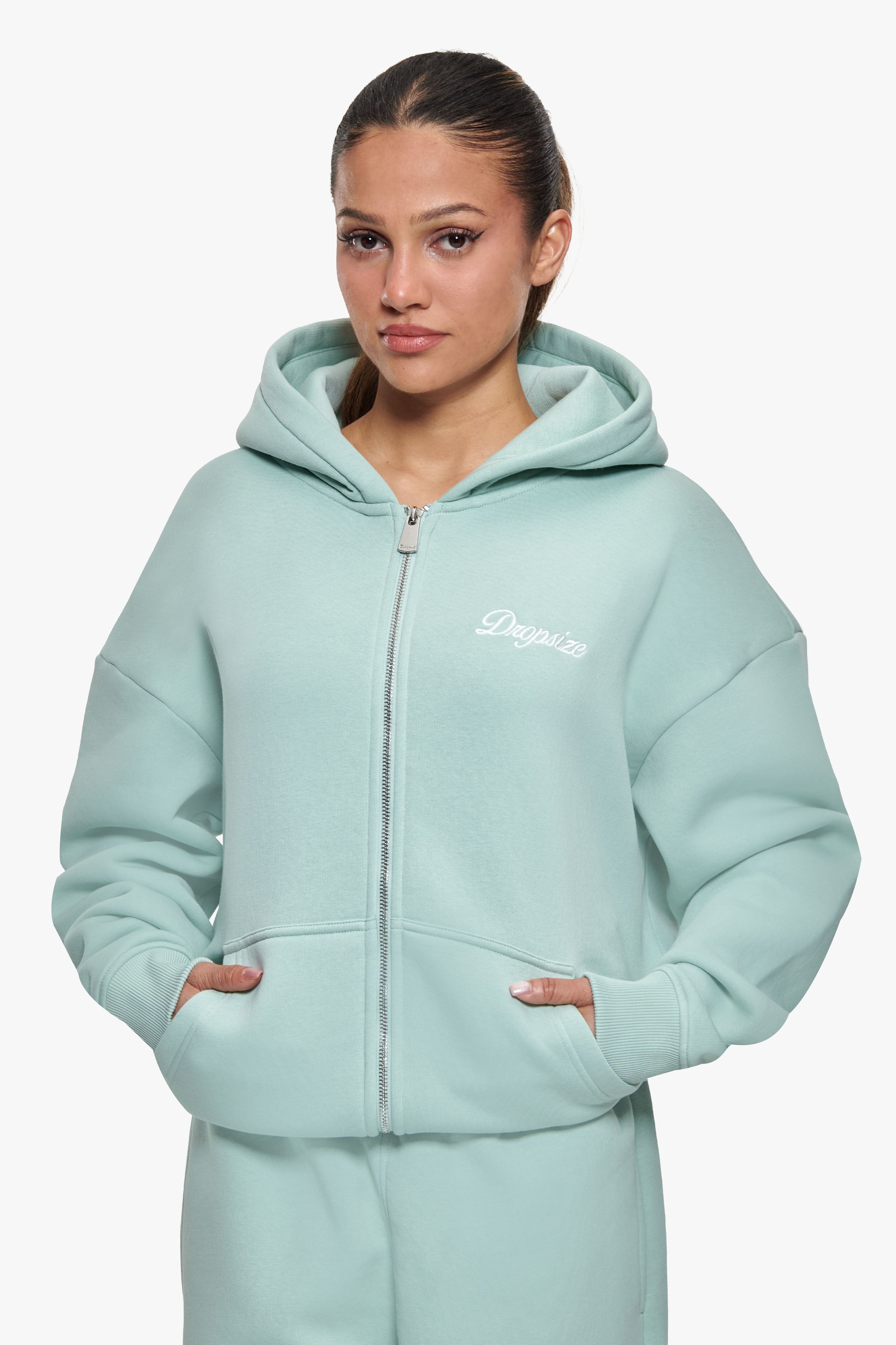 WOMEN CONTRAST EMBO ZIP HOODIE BABY BLUE