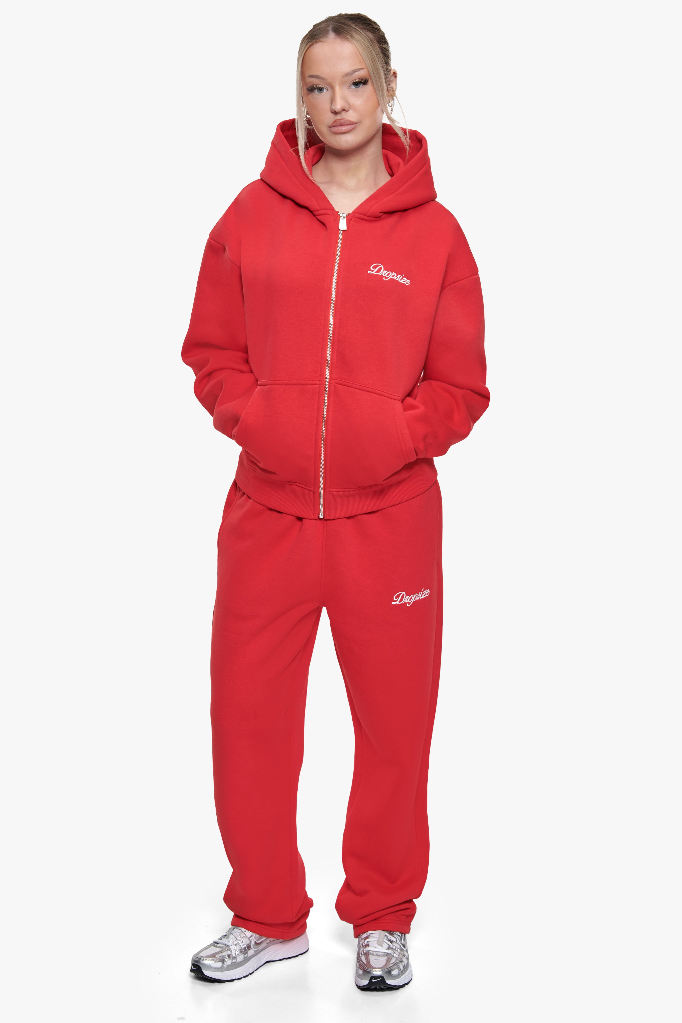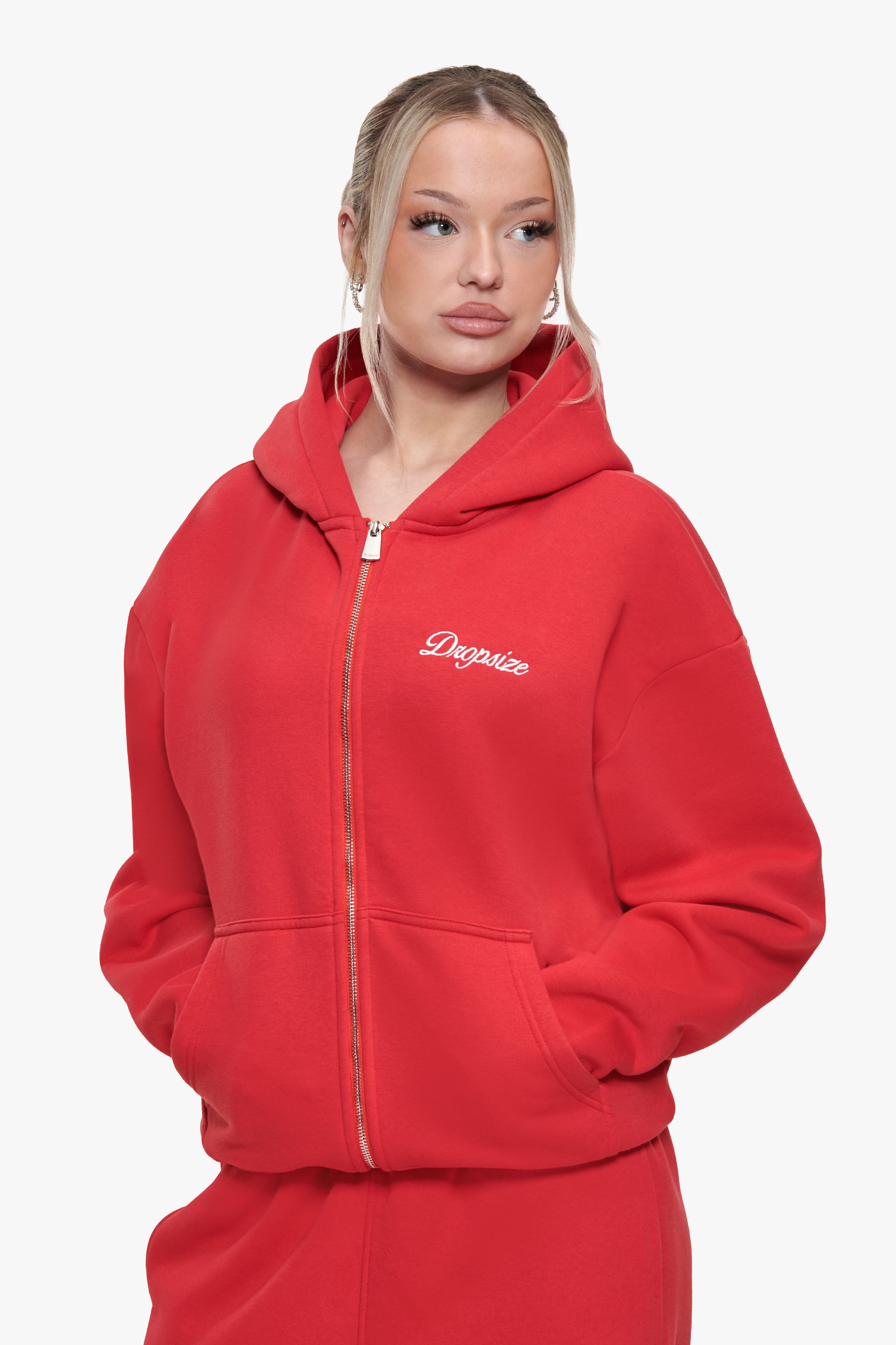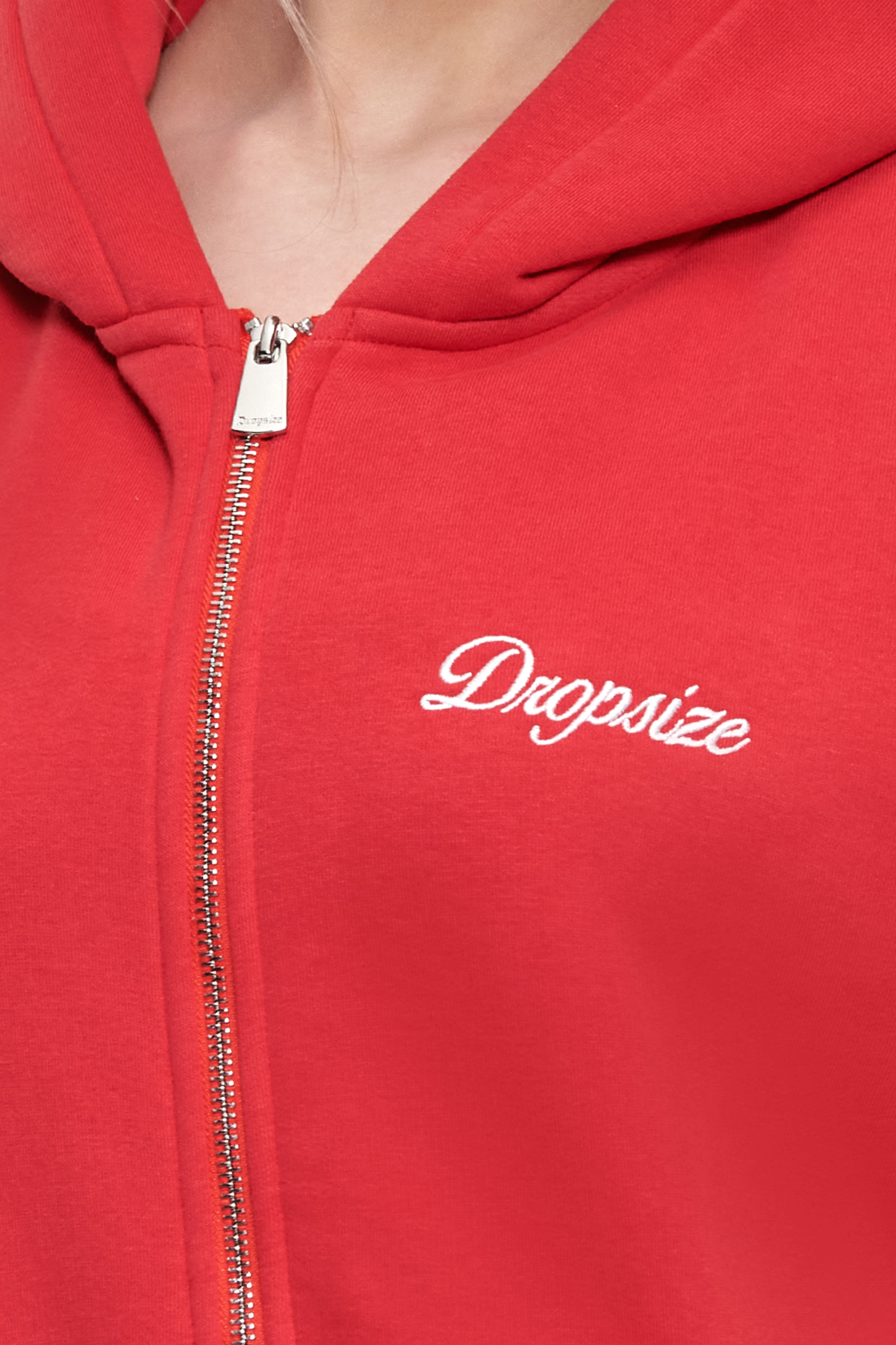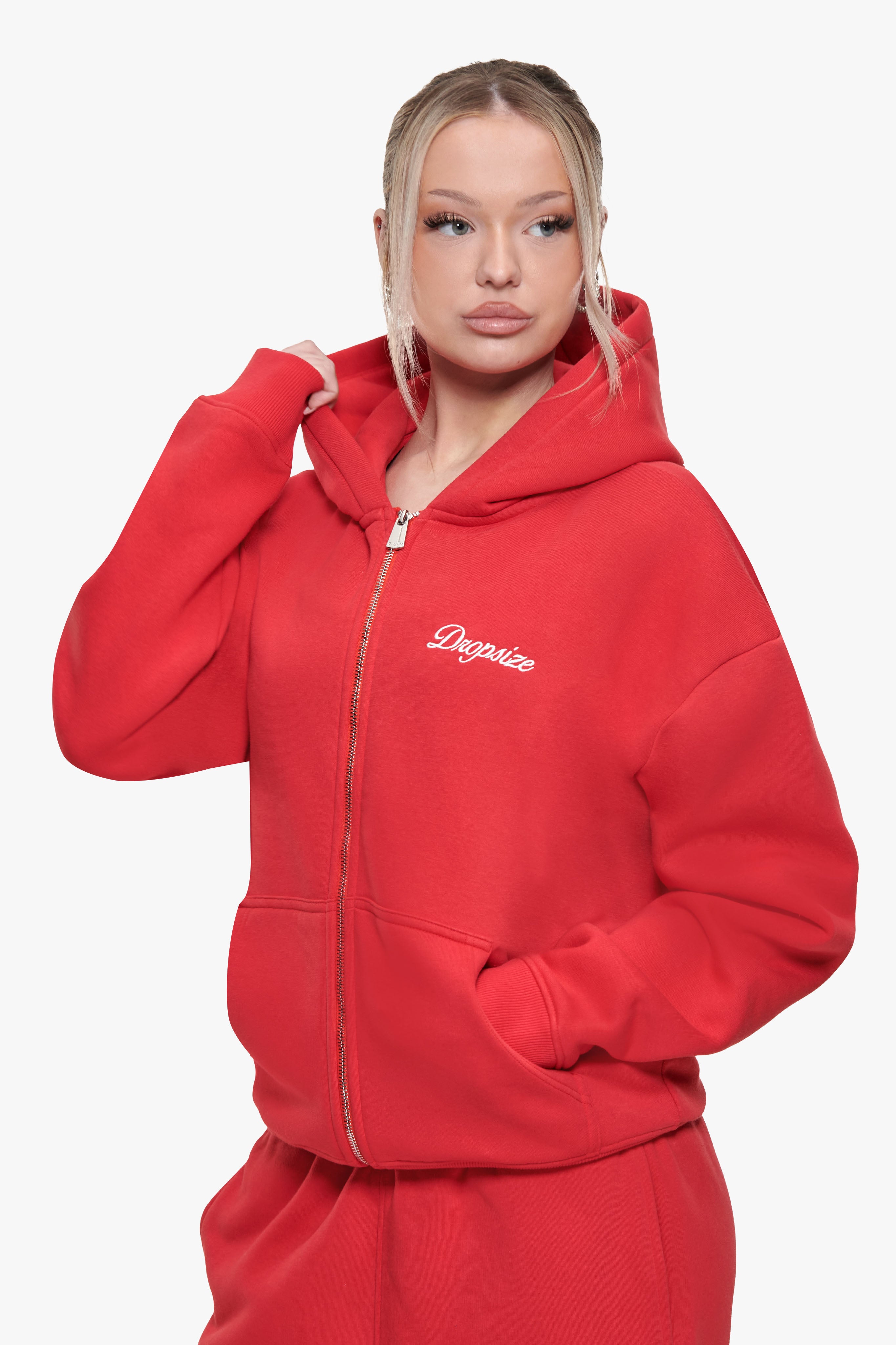 WOMEN CONTRAST EMBO ZIP HOODIE RED
