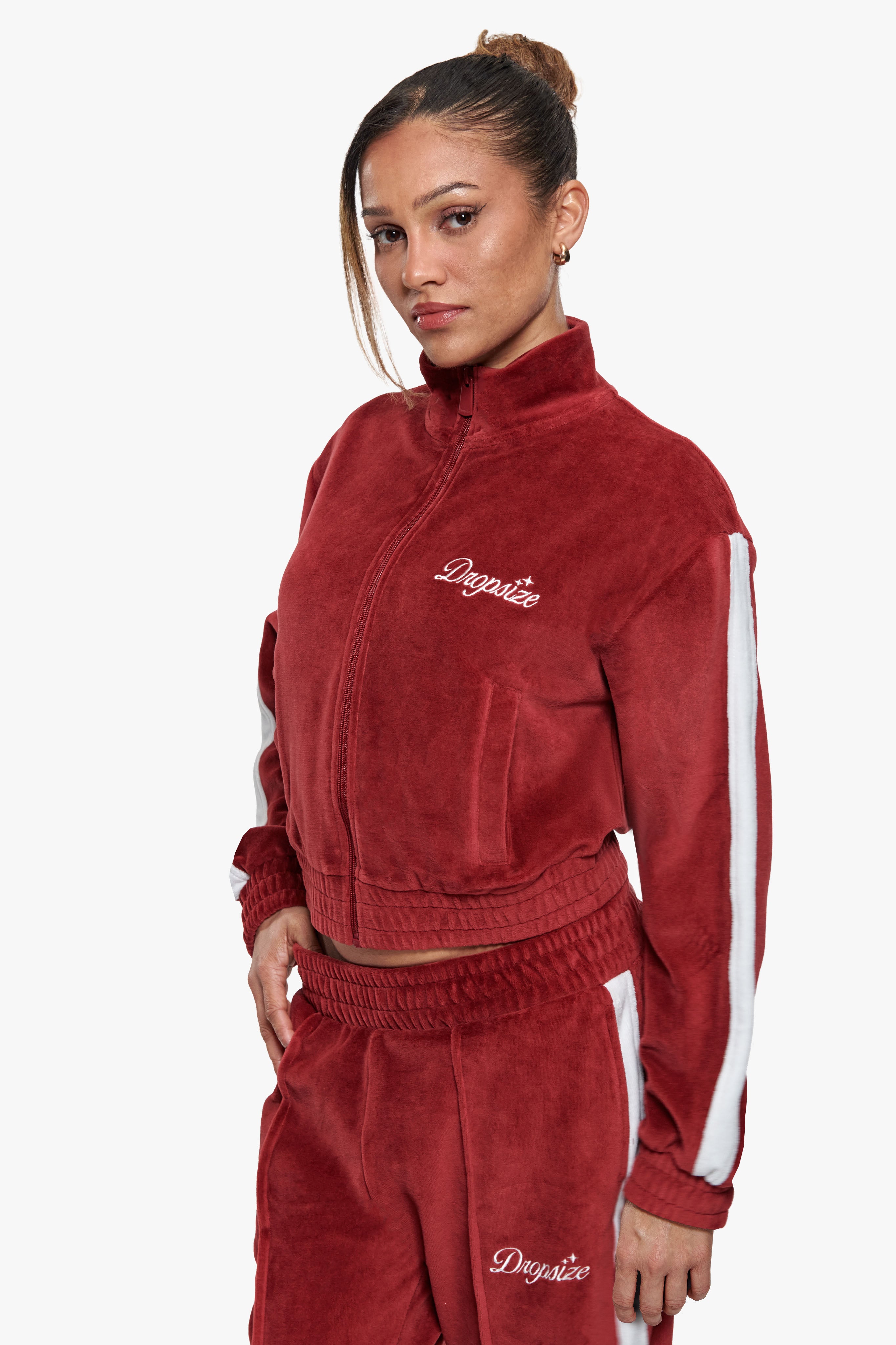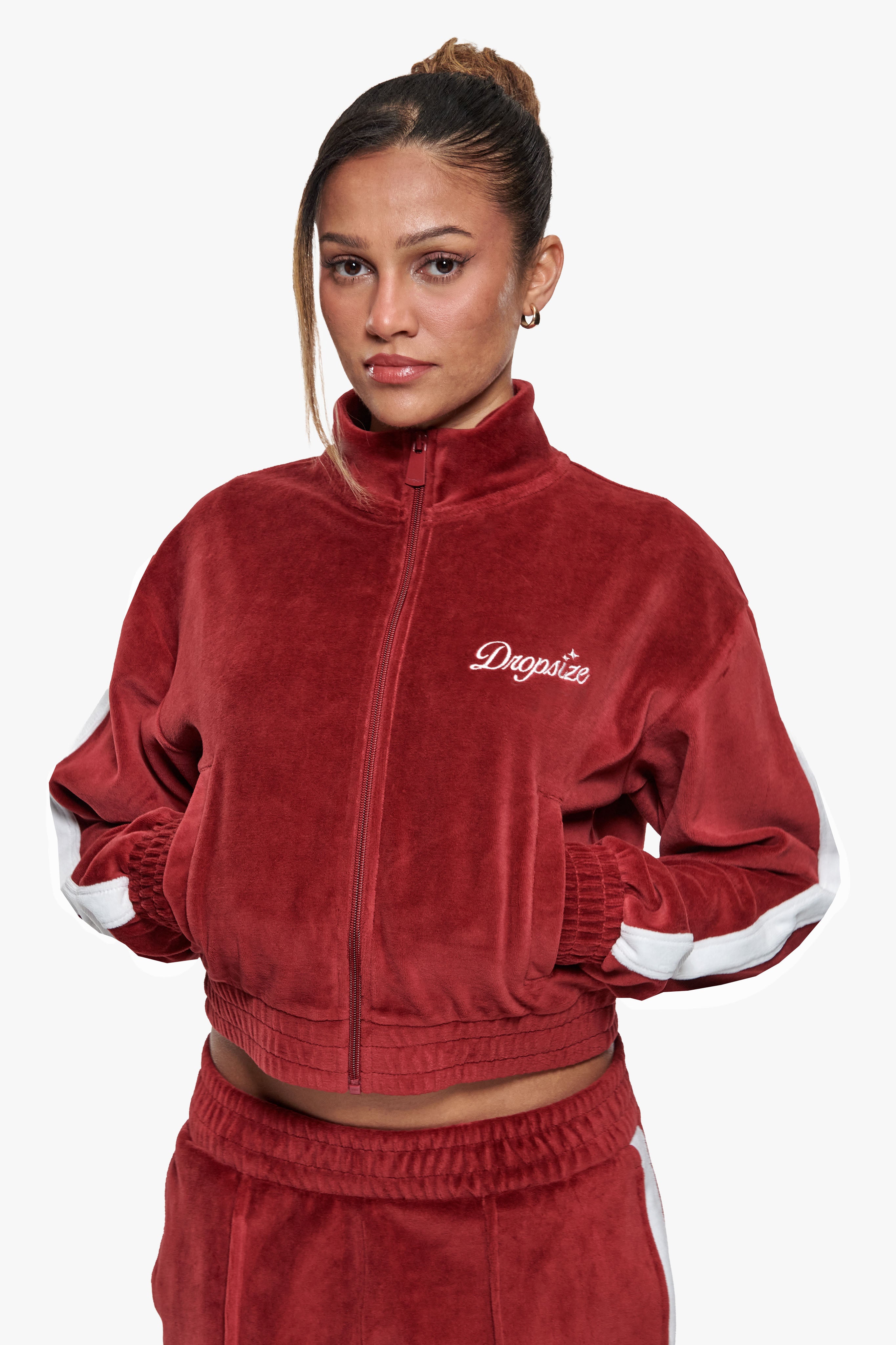 WOMEN VELVET ZIP JACKET BURGUNDY RED